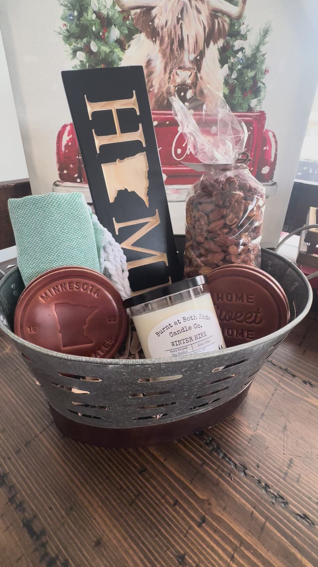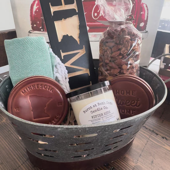 Each set features a handcrafted state sign, a premium cotton tea towel, and a locally poured candle that adds a cozy touch to any space. The basket also includes a set of four coasters, with your choice of state design or “home” theme—perfect for showing off local pride.